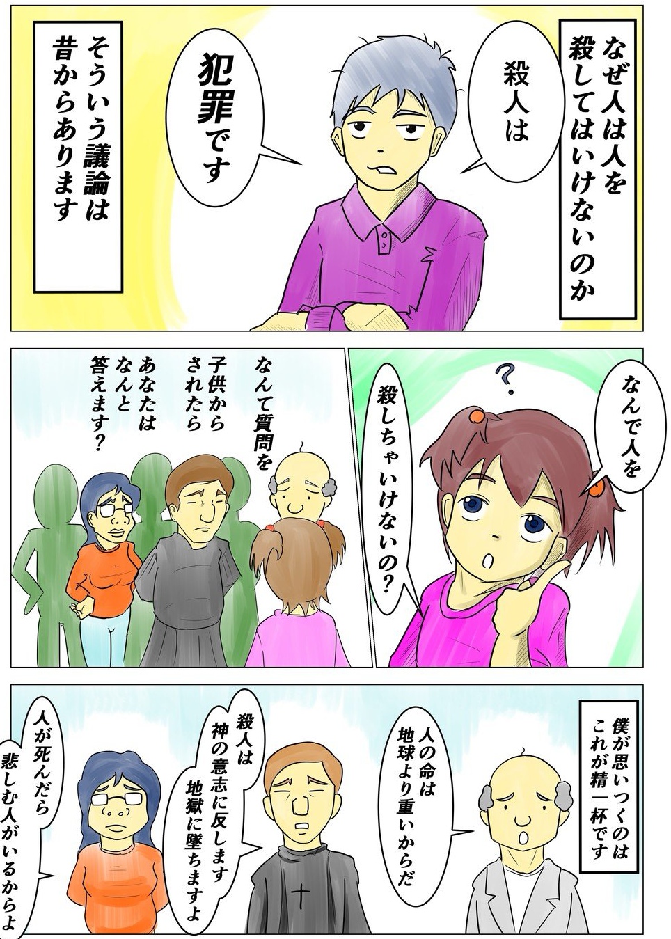 殺人して良いってなったら自分も殺されても何も文句言えなくなるからって言うのがベストじゃないなりにもベターな回答だと思う