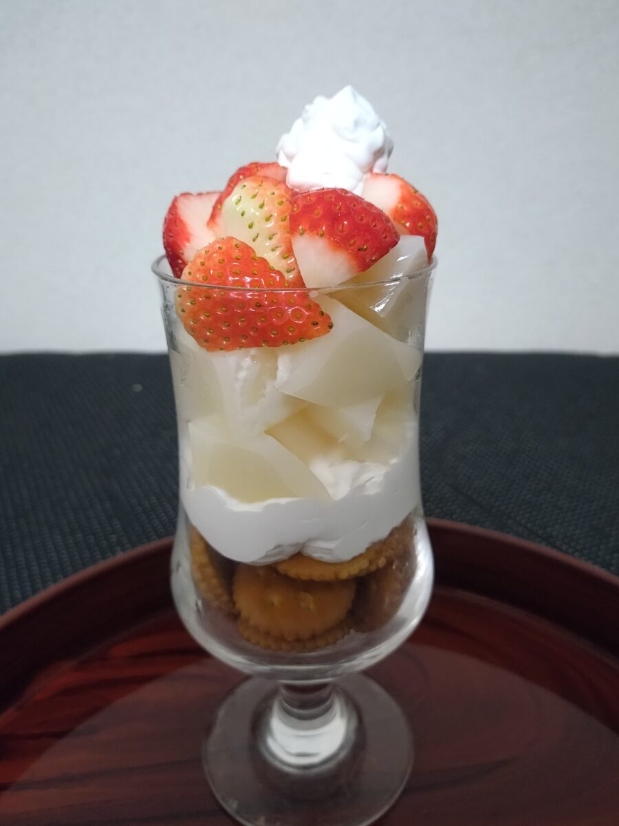 下のビスケットを入れすぎてメインの牛乳寒天とイチゴがあまり乗りませんでした
