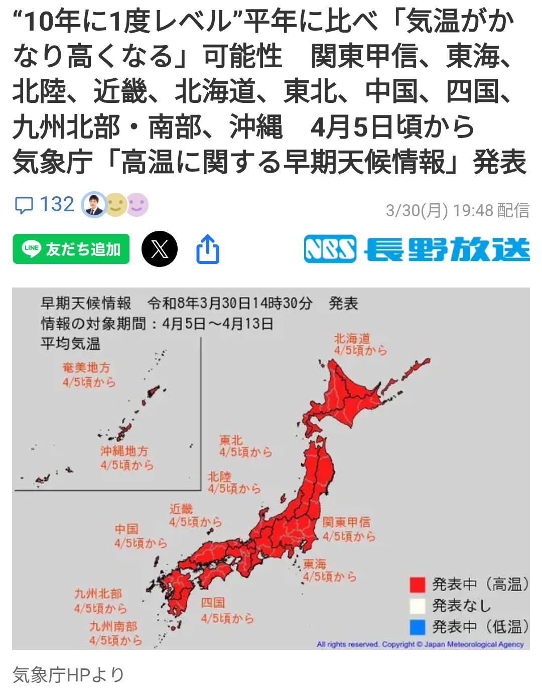 週刊10年に1度「レベルの気温がかなり高くなる」