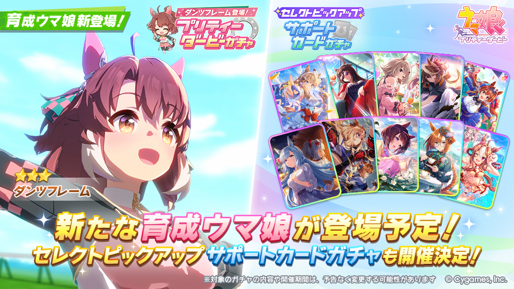 10/18(土) 21:00から、「ダンツフレーム登場! プリティーダービーガチャ」に★3ダンツフレームが登場予定です!
